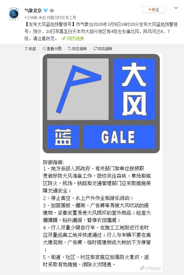 市气象台2020年3月9日16时20分发布大风蓝色预警信号:预计,10日早晨至白天本市大部分地区有4级左右偏北风,阵风可达6、7级,请注意防范。