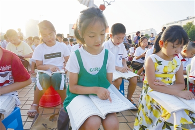 这项由平桥区二小发起、学生自愿参与的“蓝天课堂晨起读书会”活动,自7月初开始,已经开展了一个多月,发展了会展中心站、世纪广场站等依托文化广场、社区中心的多个晨读场所站,吸引了3000多名学生参与,在平桥掀起了一股国学经典晨读热潮。“绵世泽莫如为善,振家声还是读书”,每天带领学生晨读的平桥区二小校长杨磊自豪地说,“学校已经坚持国学诵读4年,学生的诵读热情一旦被激发,根本停不下来。即使遇到阴雨天气,学生也会通过班级群、小区群等多个微信群进行诵读。晨读活动开展一周,得到了很多学生家长的响应,连外校学生的家长也带着孩子加入到队伍中。”
