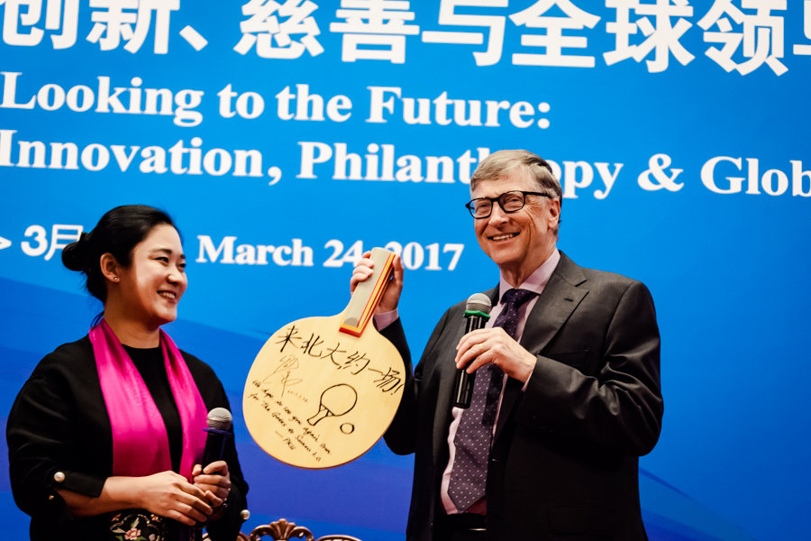 当天演讲结束,北大教师、前乒乓球世界冠军刘伟代表北大师生赠予比尔·盖茨一只乒乓球拍,球拍上用中文写着:来北大约一场。