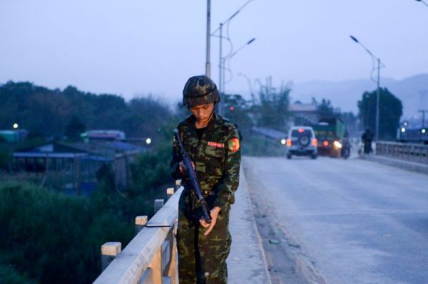 5月12日,一名民兵在缅甸木姐的一座桥上执勤。(法新社)