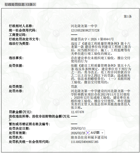 公示内容显示,河北隆尧第一中学建设的阶梯教室项目于2021年11月交付使用,但直至2025年12月才完成竣工验收。针对该单位“未组织竣工验收,擅自交付使用”的行为,隆尧县住房和城乡建设局依据相关法规,于2026年2月13日对其处以12.677478万元人民币的罚款。